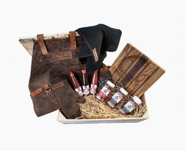 This pack includes a logo-embossed thermo-wood BBQ sauce and spice box, made exclusively from a first-class selection of premium Hungarian peppers, home-grown BBQ and grill seasonings courtesy of Buffalo Red and JD’s BBQ. In addition, the whole Grillandia chef outfit set comes complete with a 100% pull-up cowhide heat-resistant BBQ apron and gloves, complete with a 100% cotton Grillandia BBQ towel. The gloves and grill towel can be hung on the apron so they are always to hand when you need them while preparing and cooking. And to top it all off, there’s a wonderful cutting board and tray combo made from 100% organic black walnut, Japanese acacia and oak wood. It won’t dull your knife and is an extremely resistant and long-lived piece to have around the house, with proper care. The uniquely beautiful and practical three-cleft serving side is equally suited for grilling, serving, garnishing or just enjoying a meal in a stylish way. A very useful and special piece that will make your kitchen even more beautiful. Wood and Leather are natural materials so the product you order may differ slightly from the one you see in the picture. We reserve the right to make some changes.