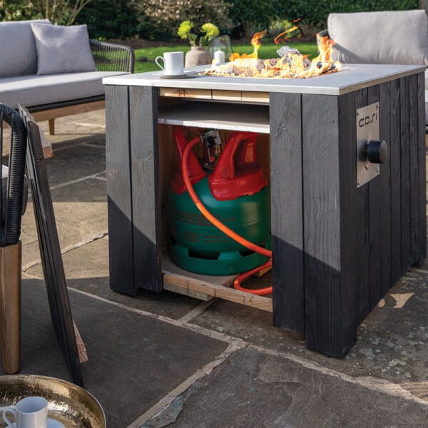 The robust and stylish Cosicube 70 is contemporary in style and features a wooden exterior, which suits its outdoor surroundings. The Cosicube has an easy-to-use, electronic ignition that works with a battery. The fire pit works with a 5KG propane gas bottle, which can easily be positioned through an invisible door.