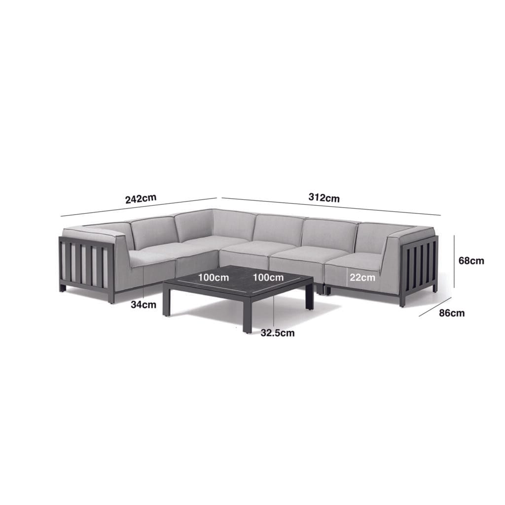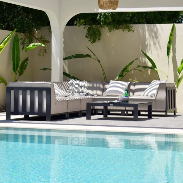 The Ibiza Medium Corner Sofa Set is a luxurious, modular outdoor seating arrangement designed to elevate your outdoor living space. Finished in an elegant oatmeal outdoor fabric, this set combines modern sophistication with exceptional comfort. Its modular design allows for flexible seating configurations, making it perfect for hosting gatherings or simply lounging in style.