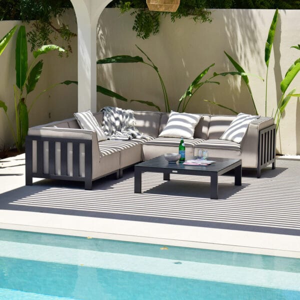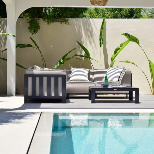 The Ibiza Small Corner Sofa Set is a luxurious, modular outdoor seating arrangement designed to elevate your outdoor living space. Finished in an elegant oatmeal outdoor fabric, this set offers modern sophistication and exceptional comfort. Its modular design allows for flexible seating configurations, making it ideal for both gatherings and relaxing in style.